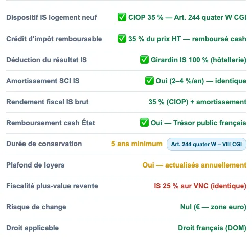 En 2026, aucun dispositif fiscal IS en France métropolitaine ne permet d'obtenir un crédit d'impôt remboursable en numéraire sur un investissement immobilier. Le CIOP (art. 244 quater W CGI) offre à toute société IS - quelle que soit sa taille ou son secteur d'activité - un retour garanti de 35 % du prix de revient HT versé directement par le Trésor public, tout en constituant un patrimoine immobilier de qualité à La Réunion, territoire français en zone euro, sous droit français.