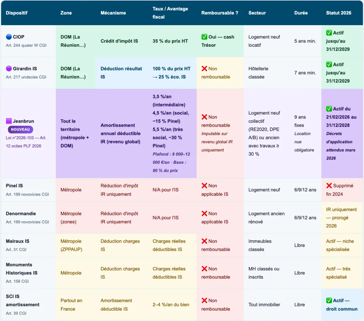 En métropole, les dispositifs de défiscalisation immobilière IS sont quasi inexistants. Le Pinel IS a été supprimé fin 2024. Le Denormandie est réservé à l'IR. La Réunion offre, grâce à son statut de DOM, des avantages fiscaux IS sans équivalent en France hexagonale - avec la sécurité juridique du droit français et la monnaie euro.
